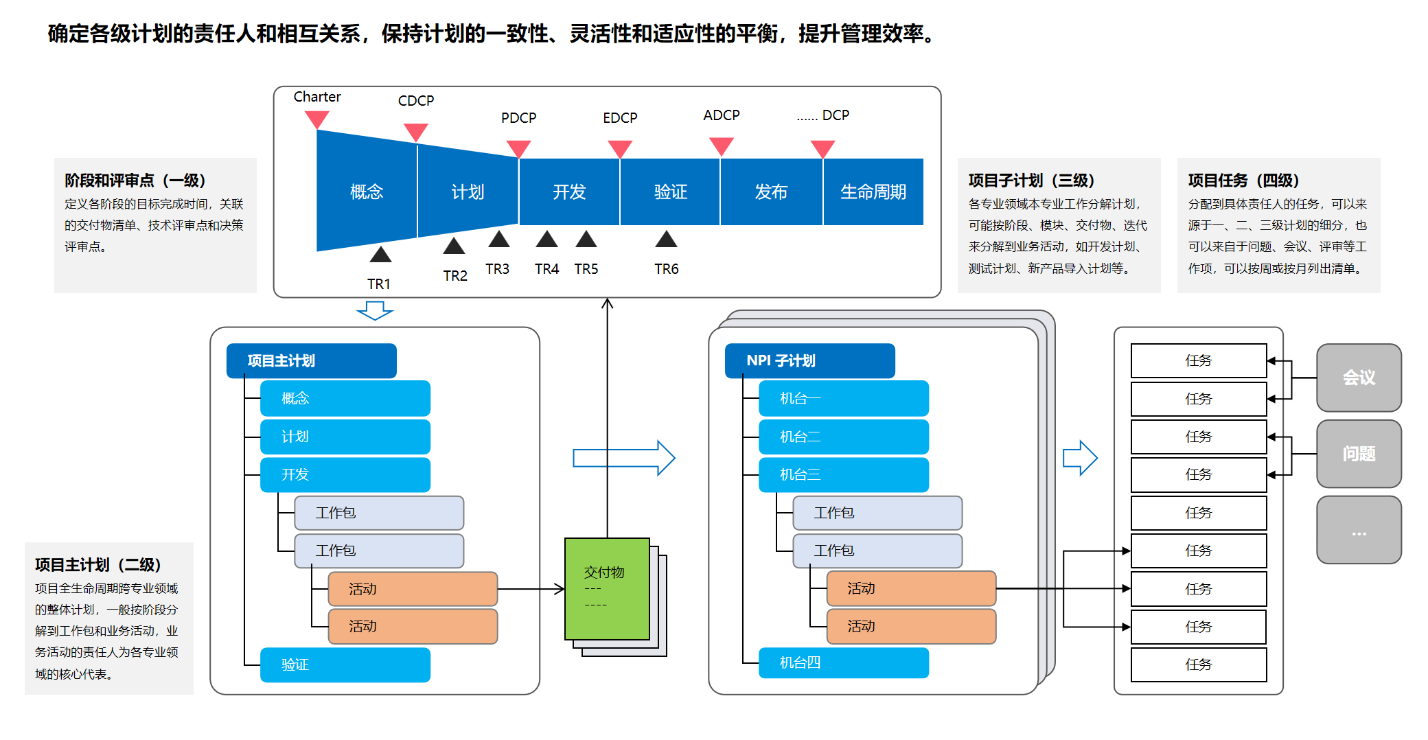 通过“阶段-主计划-子计划-任务”的层层拉通,实现全生命周期、跨领域的统筹规划。