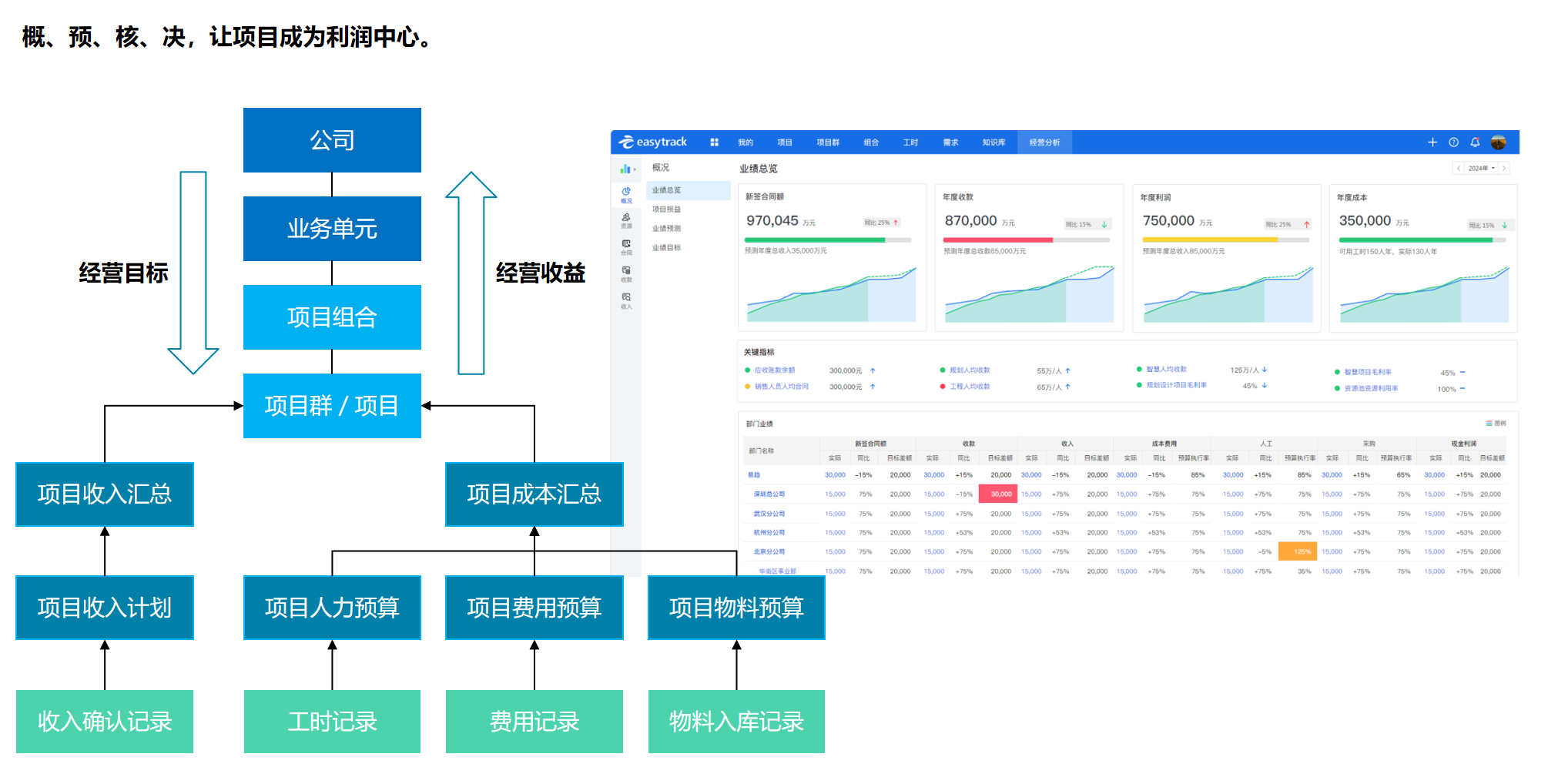 实现以项目为单元的概算、预算、核算、决算全流程管理,让项目成为清晰的利润中心。