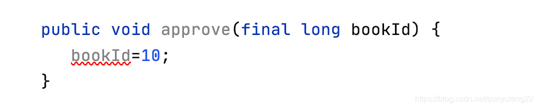 该博客内容展示了在Java代码中,使用`final`关键字修饰局部变量后却尝试修改其值的错误做法。代码示例中,`bookId`被声明为`final`,但在函数内部尝试将其值更改为10,这种行为在Java中是不允许的,因为`final`变量一旦初始化后就不能再次赋值。