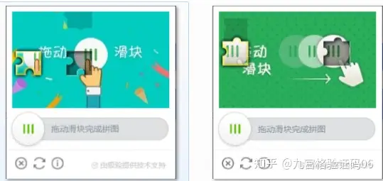 从两张图可见,极验滑动验证码由一个小拼图和大背景图组成。拼图形状多样,背景图中有一缺口,其形状与拼图相符。