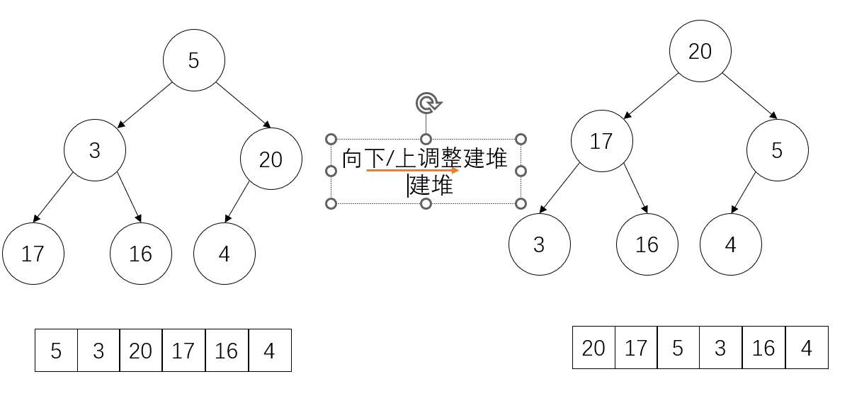 在已有一个大堆的前提下,把根的值改变(此时破坏大堆的结构),再一路向下调整,可以重新建堆