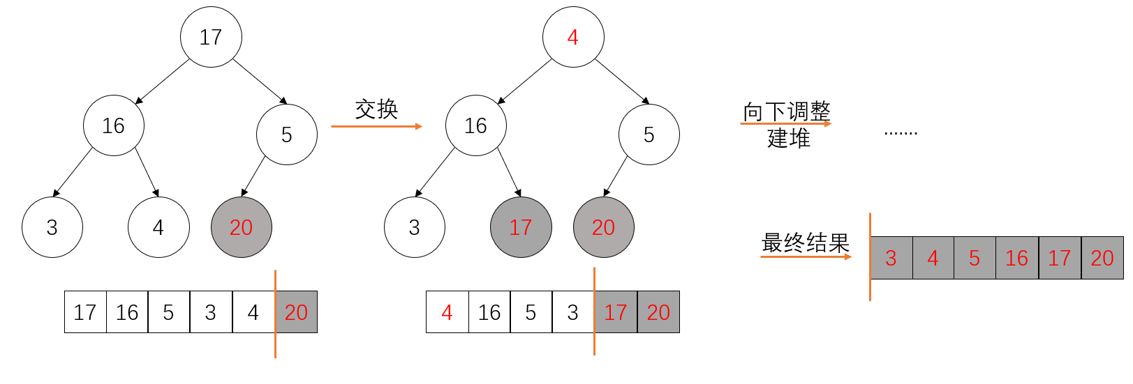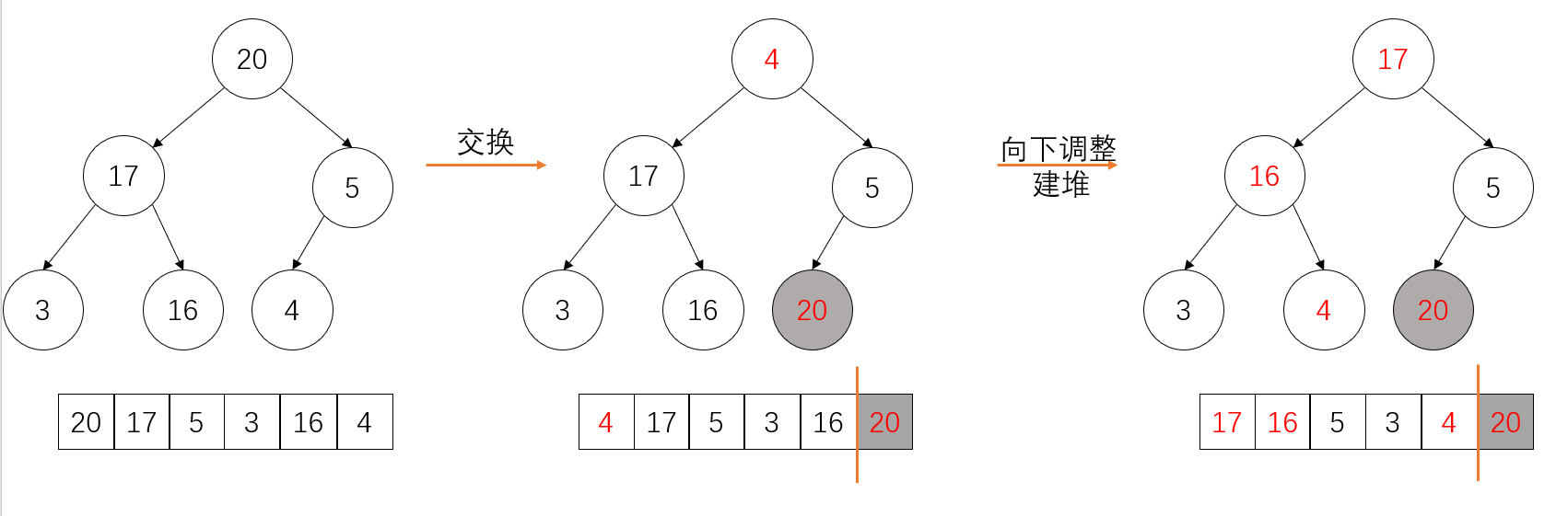 但建堆选出的最大的的值在根处,所以把根和最后一个叶子节点交换,交换后,此时待排序的数中的最大值以完成排序(即倒着排),把最后一个叶子节点从堆中除外,再从根开始一路向下调整即可重新建堆,如此循环