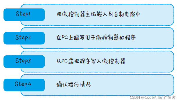 在实际使用微控制器时,需要串行端口和USB 等各种接口以及电路等。如果想自己制作设备,那么通过使用微控制器,以及安装了以上要素、名为“微控制器主板”的电路板,就能很轻松地开发硬件了。虽说每种产品的规格各有不同,但基本上是以图所示的流程进行开发的。