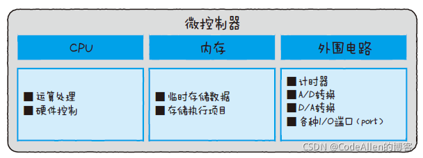 微控制器由内存(用于存储程序和保存临时数据)、CPU(用于执行运算处理和控制)以及外围电路(包含与外部的接口,以及计时器等必要的功能)构成。