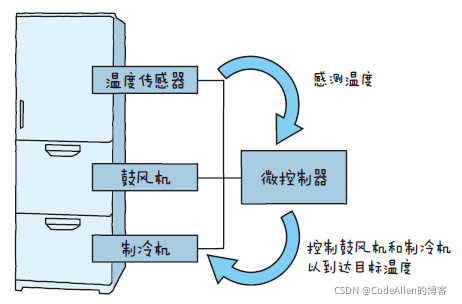 冰箱内部能够达到某个目标温度,是因为微控制器里写有一个程序,这个程序的作用就是监视连接在微控制器输入端子上的温度传感器的状态,并控制制冷机以达到目标温度。利用传感器测量和判别信息就叫作感测。