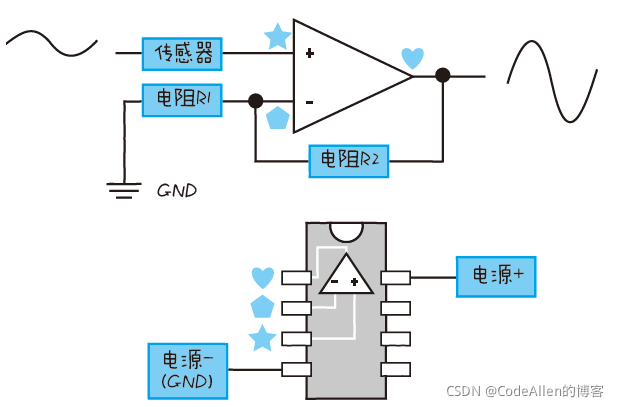 保持输入信号的极性的同时将其放大输出,图中三角形处就是运算放大器,它的各个端子连接着电阻等元件。