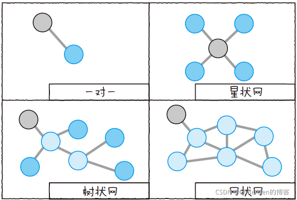 IEEE 802.15.4/ZigBee 是一种使用2.4 GHz 频段的近距离无线通信标准。其特征是虽然传输速度低,但是与Wi-Fi 相比,其耗电量较少。如图所示,ZigBee 可以采取多种网络形式。其中,网状网
