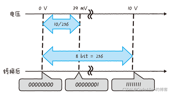 而分辨率也是一个指标,它表示的是能把模拟信号分割到多细,表现形式为“最多能分到多细”。例如8 bit 的A/D 转换器就能分成28 = 256,这就是分辨率。打个比方,8 bit 的A/D转换器处理10 V 区间的信号时,就无法测出低于39 mV 的电压差。