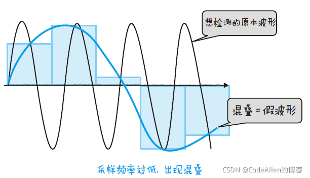 采样频率是一个指标,它决定了每次采样应该隔多长时间。如果对输入信号的频率应用了过低的采样频率,就会出现如图所示的情况,即出现一个与本来的波形完全不同的波形,这个波形是冒充测算波形的假波形,这样的假波形叫作混叠。具体来说,采样频率必须在输入信号最高频率的两倍及两倍以上,这样才能预防出现混叠。