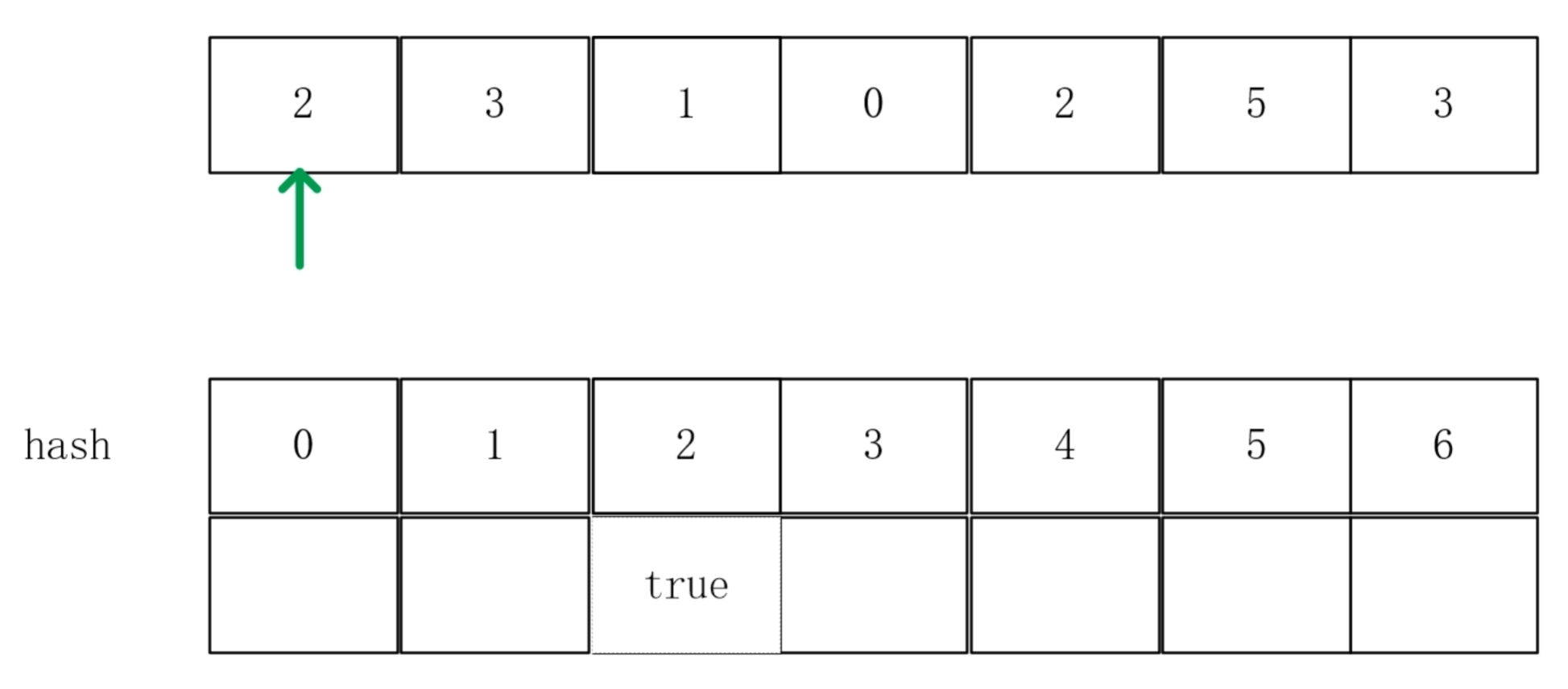 遍历数组,如果该数字未出现就将hash表对应值设置为true,