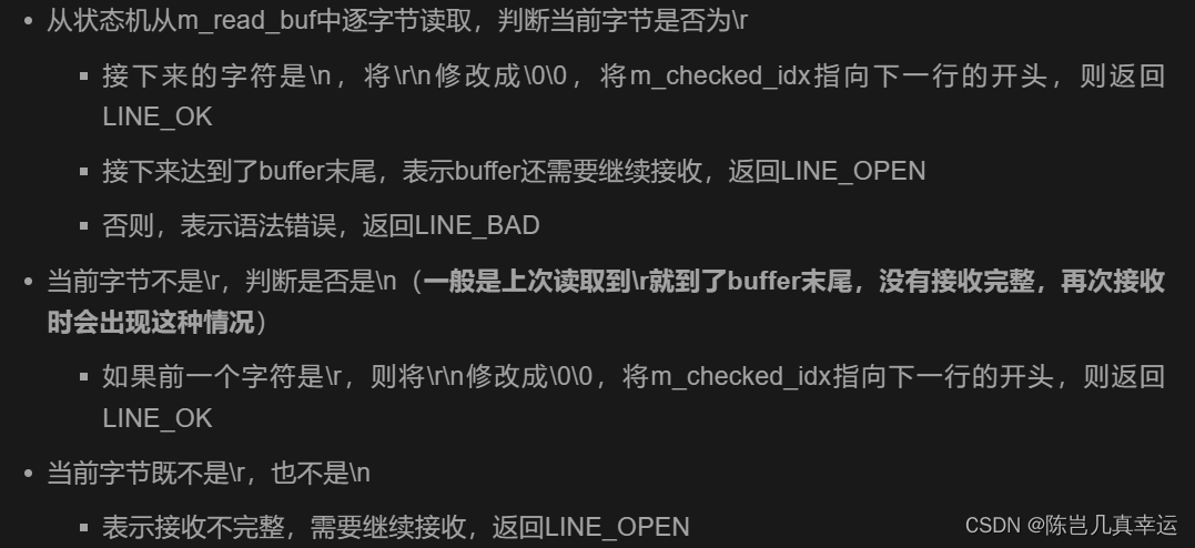 GET请求中每一行的末尾都是\r\n结束的,所以我们只需要判断line_status = parse_line()) == LINE_OK语句即可。