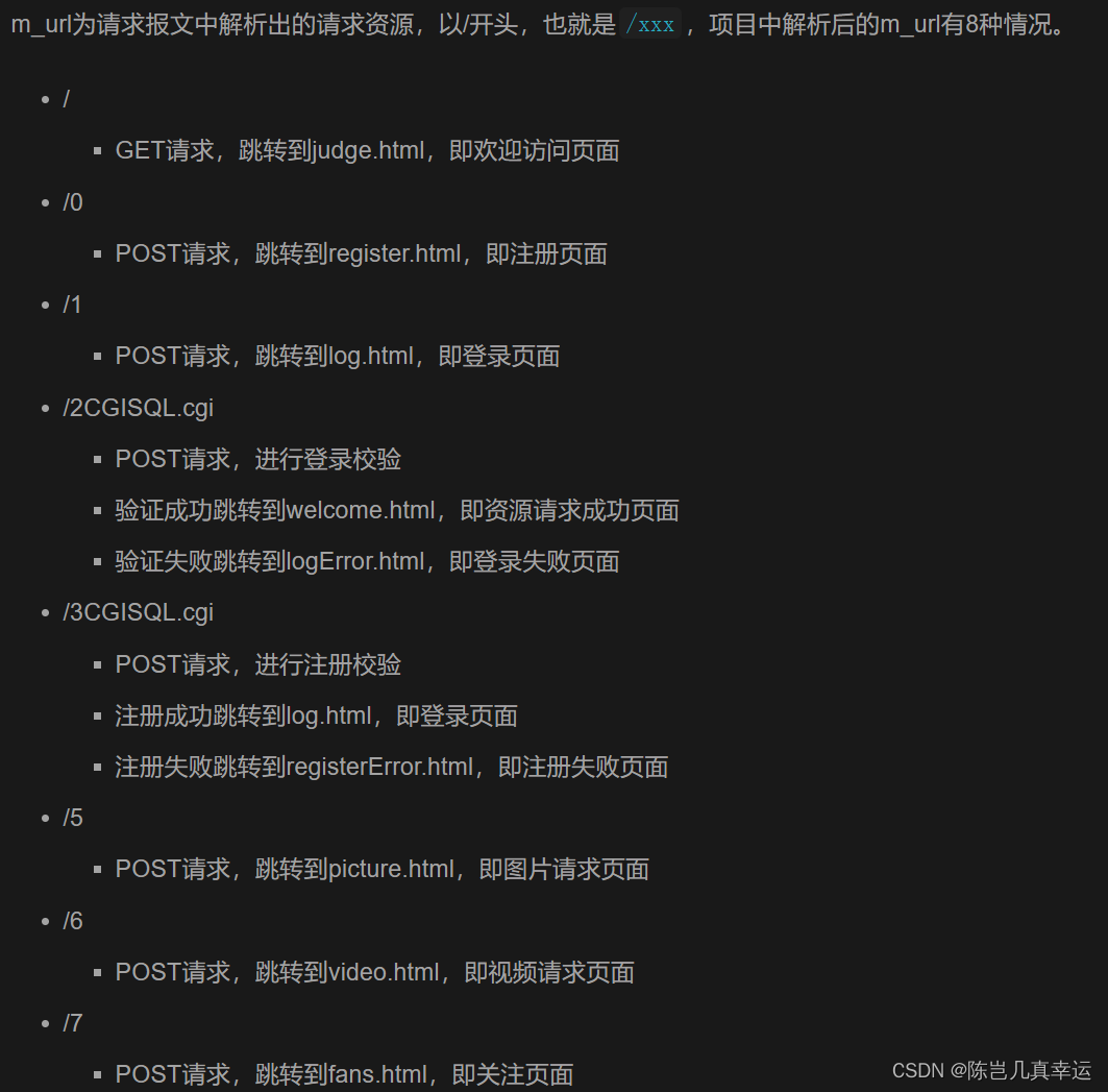 表示HTTP请求的处理结果,在头文件中初始化了八种情形,在报文解析与响应中只用到了七种。