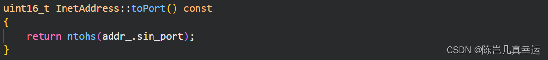 #pragma once #include <arpa/inet.h> #include <netinet/in.h> #include <string> //封装socket地址类型 class InetAddress { public: // explicit 方式隐式构造 //构造函数 explicit InetAddress(uint16_t port, std::string ip = "127.0.0.1"); explicit InetAddress(const sockaddr_in &addr) : addr_(addr) {}; std::string toIp() const; uint16_t toPort() const; std::string toIpPort() const; const sockaddr_in* getsockAddr() const {return &addr_;} private: sockaddr_in addr_; };