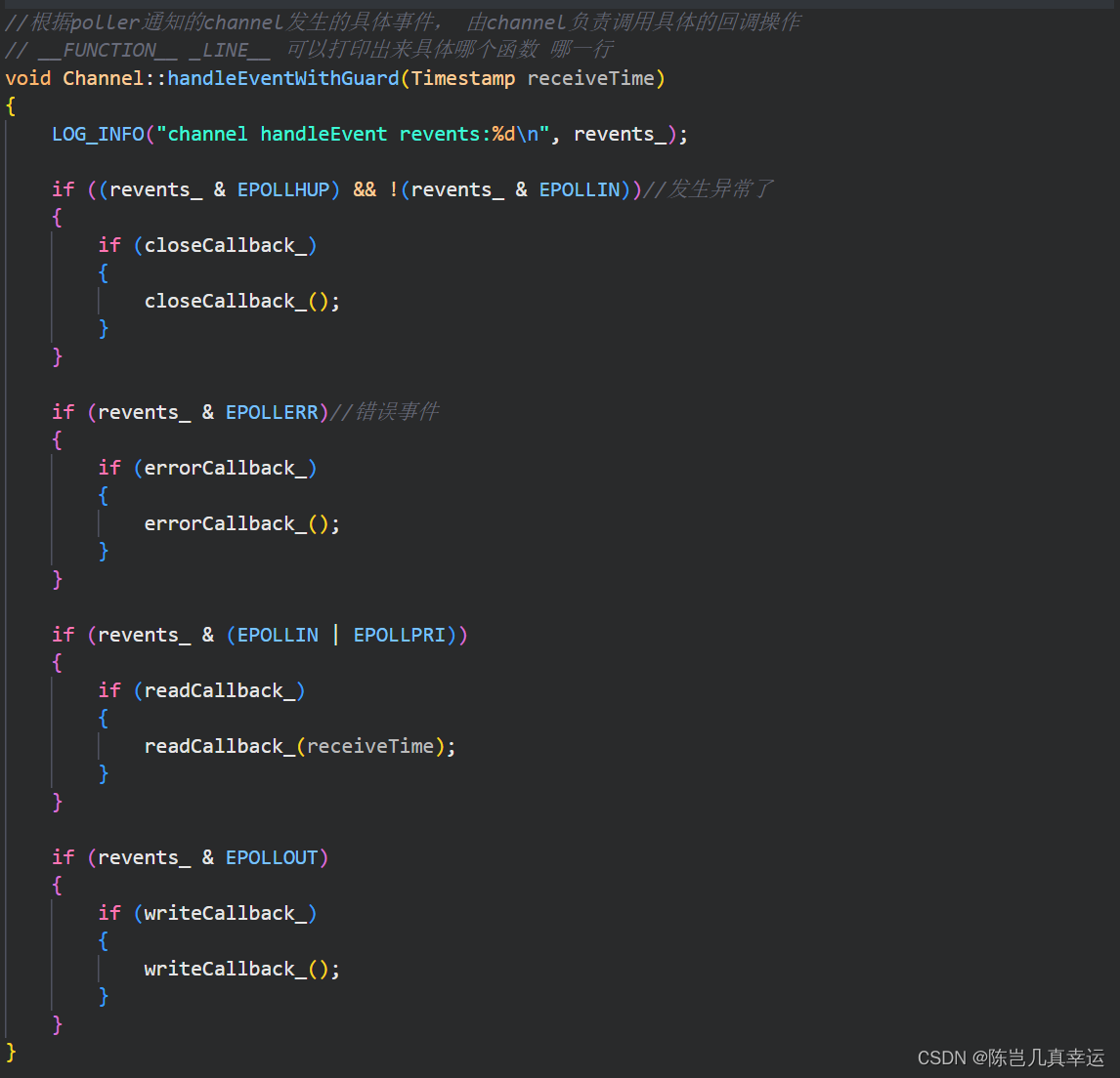 //因为channel通道里面能够获知fd最终发生的具体的事件revents,所以它负责调用具体事件的回调操作