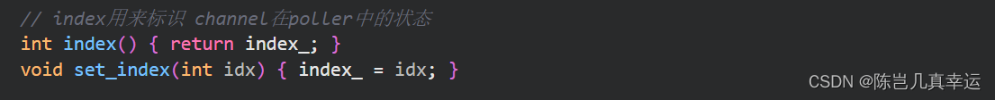 int fd() const { return fd_; } int events() const { return events_; }//fd所感兴趣的事件 int set_revents(int revt) { return revents_ = revt; } //poller监听事件,设置了channel的fd相应事件Poller(相当于epoll)监听到了发生的事件,会通过set_revents函数来设置Channel中的revents_(set_revents是给Poller提供的接口)