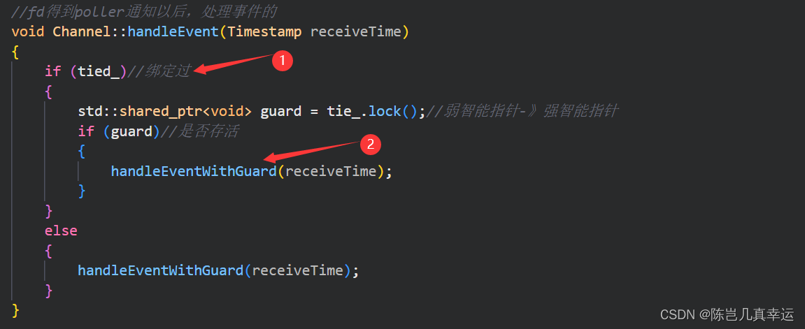 ②:绑定过后,进行进一步的事件判断,首先通过调用tie_.lock()将tie_转换为一个shared_ptr对象,如果转换成功(即guard不为空)则表明与tie_绑定的对象任然存活,可以继续处理事件。如果转换失败,则说明与tie_绑定的对象已经销毁,此时可以忽略事件处理。