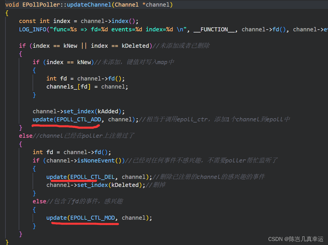 EventLoop::updateChannel调用的是EPollPoller::updateChannel函数: