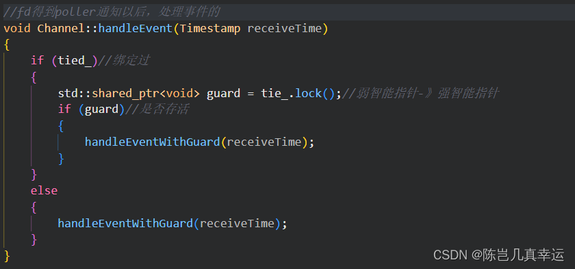 std::weak_ptr<void> tie_;//绑定自己 bool tied_;tied_初始化设置为false,tie_设置为weak_ptr,处理事件时将其升级为shared_ptr,如果升级成功则可进行handleEventWithGuard进而执行一系列回调函数。