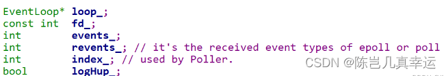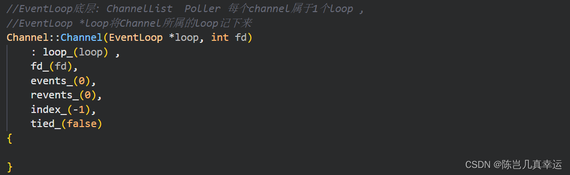 EventLoop *loop_;//事件循环 const int fd_;//fd, Poller监听的对象 int events_;//注册fd感兴趣的事件 int revents_;//Poller返回的具体发生的事件 int index_; std::weak_ptr<void> tie_;//绑定自己 bool tied_;1. EventLoop 事件循环