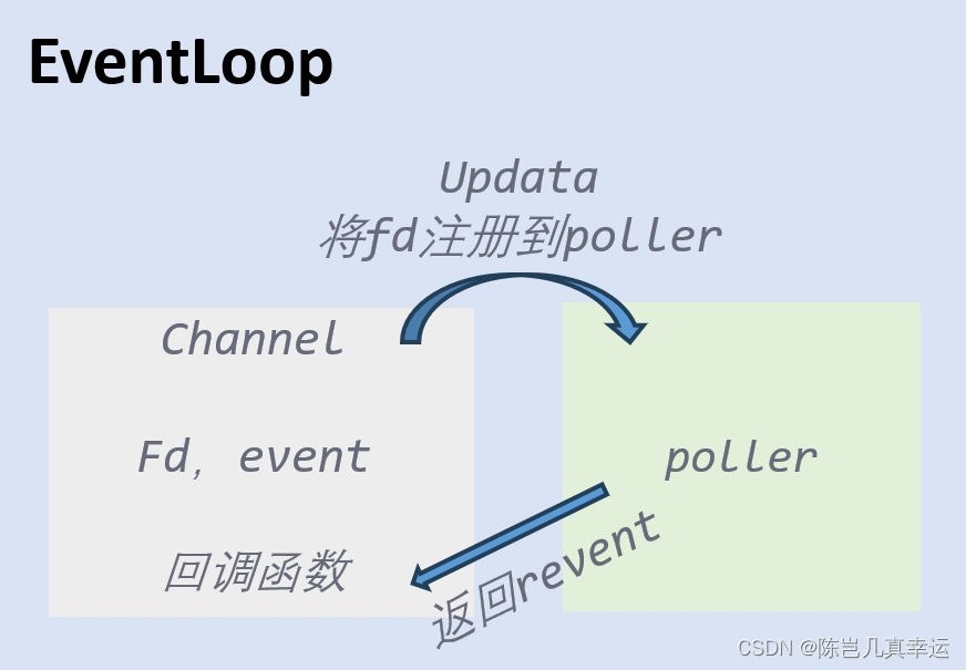 现在往简单了想Eventloop就是事件循环,事件循环最重要的两个东西一个是epoll,一个就是epoll所监听的fd以及他所感兴趣的事件,以及最终发生事件以后epollwait给我们应用通知的这个事件,那么socket fd以及感兴趣的事件,通知的事件都在channel里叫做通道,epoll本身就是这个poller了。