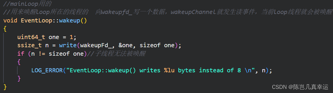 唤醒wakeupfd_://创建wakeupfd,用来notify唤醒subReactor处理新来的channel int createEventfd() { int evtfd = ::eventfd(0, EFD_NONBLOCK | EFD_CLOEXEC); if (evtfd < 0) { LOG_FATAL("eventfd error:%d \n", errno); } return evtfd; }唤醒loop所在的线程的(mainReactor用来唤醒subReactor)