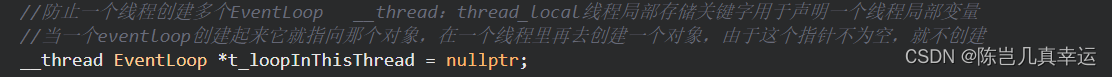 这里定义一个线程局部变量指针,t_loopInThisThread,表示该线程还没有创建EventLoop对象,如果这个指针不为空了我们就不再创建对象了,保证一个线程只有一个EventLoop。