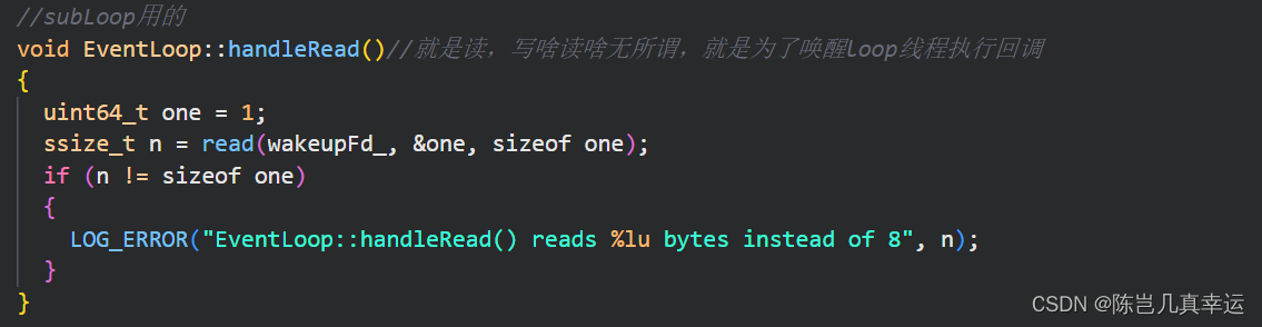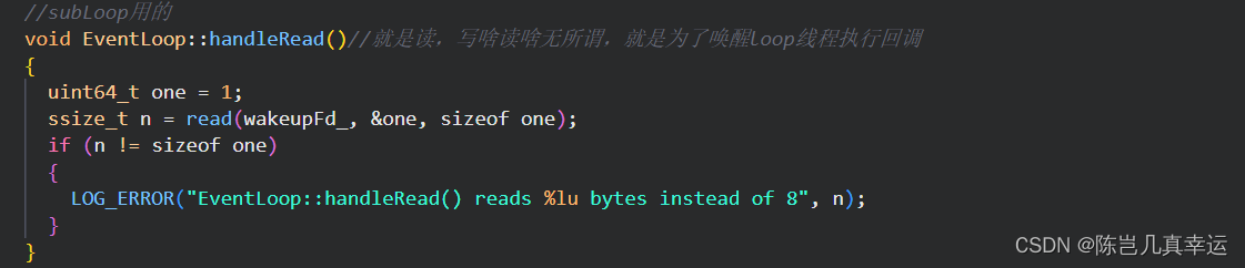 void EventLoop::handleRead()//就是读,写啥读啥无所谓,就是为了唤醒loop线程执行回调