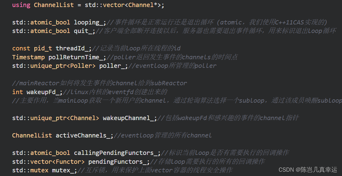 //事件循环类 主要包含了两个大模块 Channel Poller(epoll的抽象)