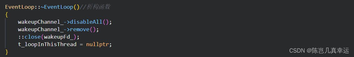 析构函数就将事件类型设置为全部感兴趣,然后把Channel从所属的EventLoop中移除,关闭fd,将t_loopInThisThread置空(防止一个线程创建多个EventLoop)。