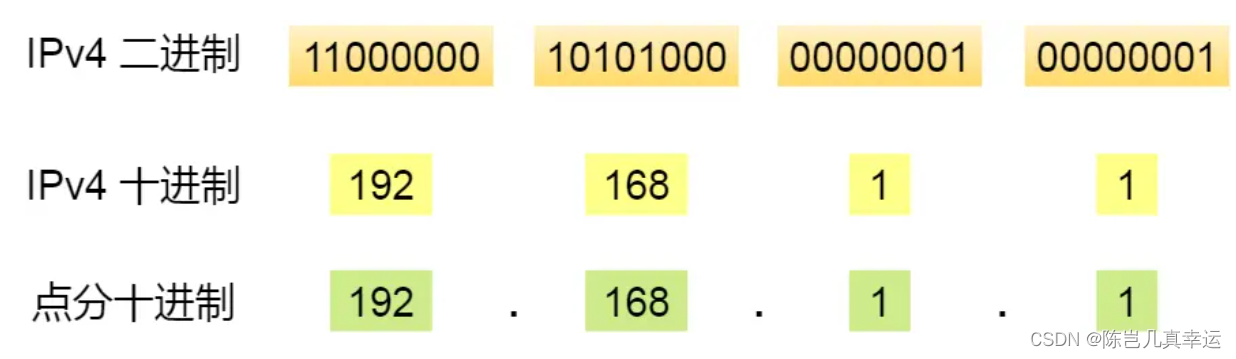 IP 地址(IPv4 地址)由 32 位正整数来表示,IP 地址在计算机是以二进制的方式处理,采用点分十进制的标记方式。