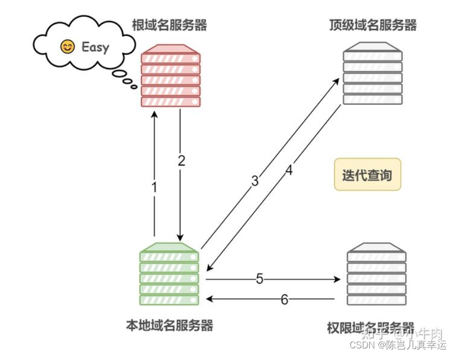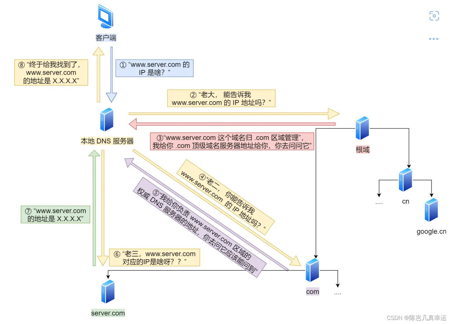 - 本地DNS服务器发送请求给权威域DNS服务器:本地 DNS 发送请求给权威 DNS 服务器,权威域DNS服务器返回www.server.com 的 IP 地址。