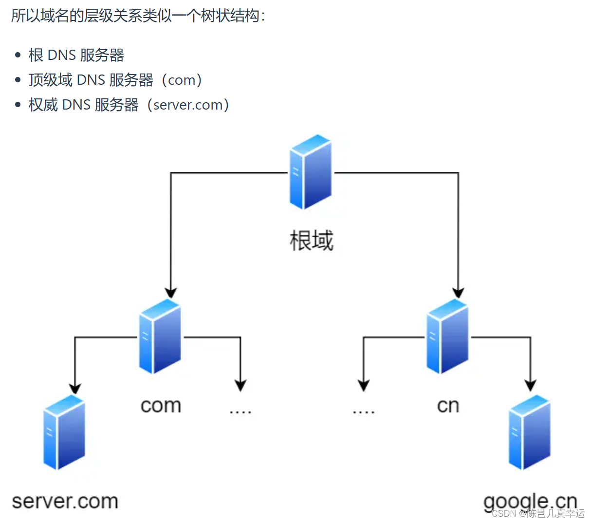 - 客户端查询本地DNS服务器:客户端发送DNS请求给本地DNS服务器(也就是客户端的TCP/IP设置中填写的 DNS服务器地址)。本地DNS服务器收到请求后,查询缓存里是否有 www.server.com,有则直接返回 IP 地址。如果没有,本地 DNS服务器会向根域名服务器发送DNS请求。