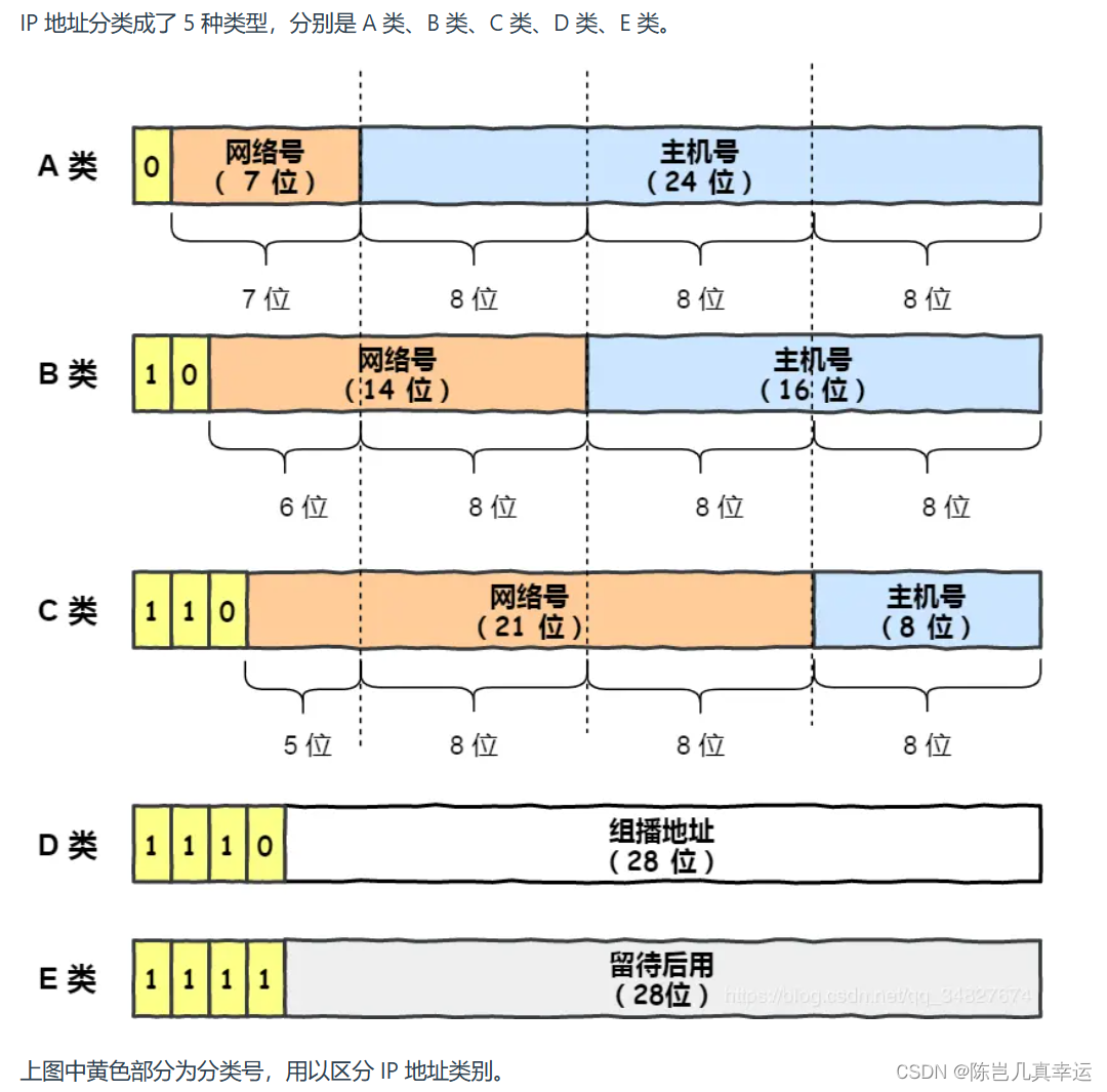 D、E类地址:没有主机号,不可用于主机IP,D类用于多播,E类是预留的分类。