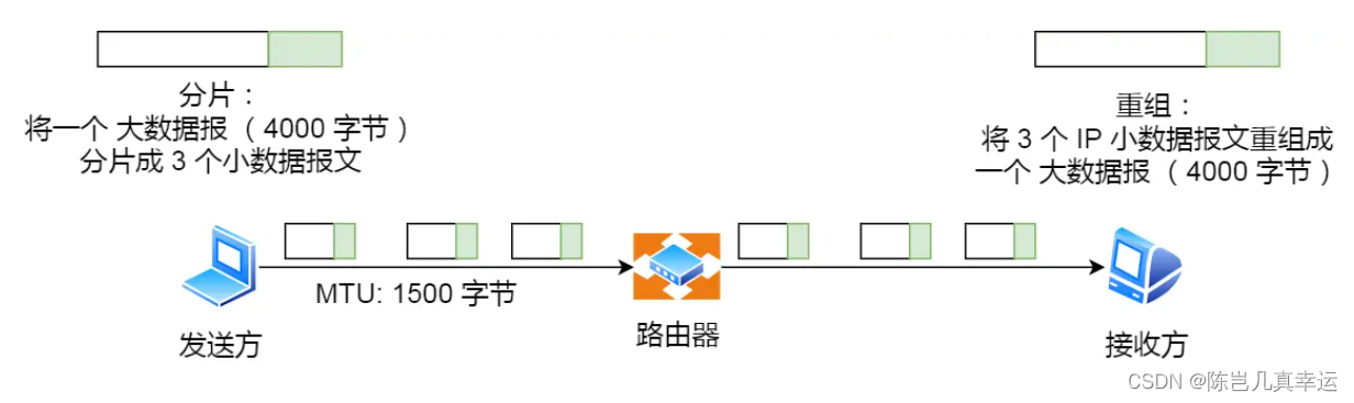 IP数据包大于MTU时,IP数据包就会被分片。路由器不重组,只会在目标主机上重组。