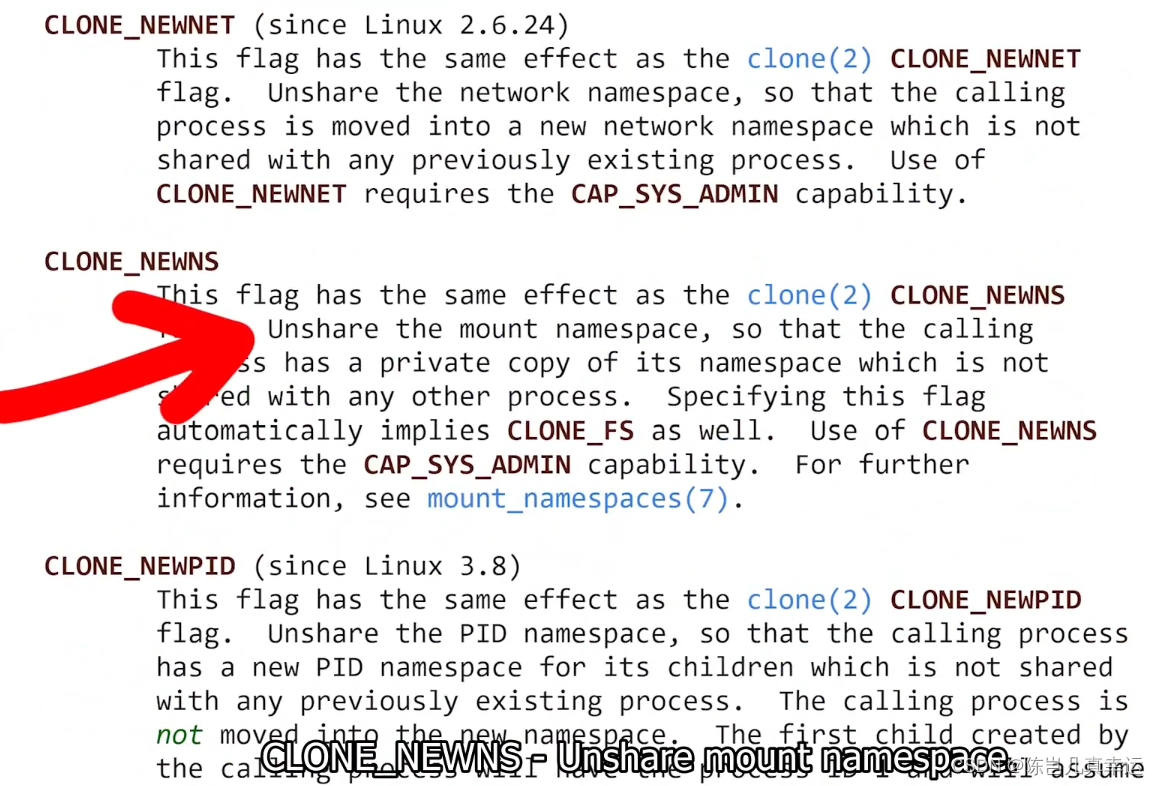 取消共享进程ID的namespace以便调用进程有一个新的pid,其子进程的namespace不与任何先前存在的进程共享,调用进程不会移动到新的namespace,调用进程创建的第一个子进程id为1,并在新的namespace中的身份为init(1)