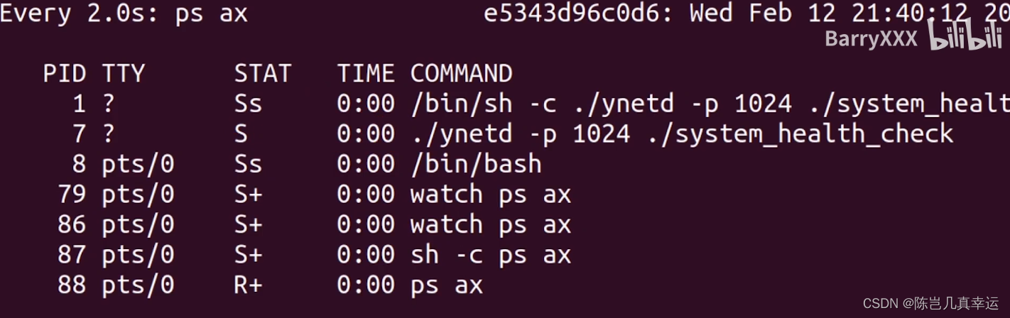 在容器下执行watch “ps ax” 去查看正在运行的进程列表(watch是每两秒查看一次命令输出)