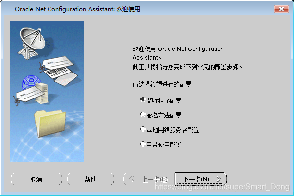 以管理员的身份启动cmd,输入netca会有一个界面,如图,这是一个对参数文件进行修改的可视化界面,要比上面操作文件来改参数要方便得多。监听程序配置实际上就是配置listener.ora配置文件的可视化界面。命名方法配置是配sql,ora的,本地网络服务配置tsnames.ora的。