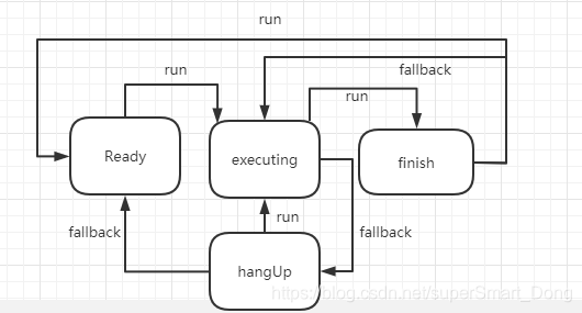 例如类Context 包含以下的流程图,context 有两个方法run 和fallback,四种状态,例如当状态Ready执行一次run操作状态变成了executing,当再执行run时就变成了完成状态,如果执行fallback就变成了hangup状态。