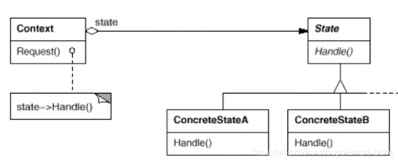 状态模式,允许对象在内部状态发生改变时改变它的行为,对象看起来好像修改了它的类。它的实现方式和策略模式相似,目的都是对if...else语句进行优化,只不过,策略模式通过外部传入枚举、条件来决定选择哪一种操作方式。策略模式中的枚举、条件相当于状态模式中的状态。状态不需要由外部传入,而是随着自身的操作来自动地变化。