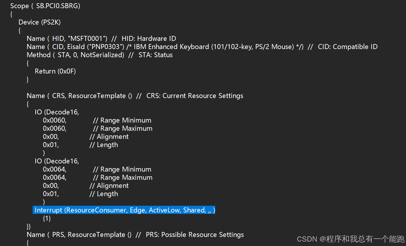 1、搜索并替换 Device(PS2K) 下面的 Name (_CRS...)的IRQ (Edge, ActiveLow, Shared, ) 替换为