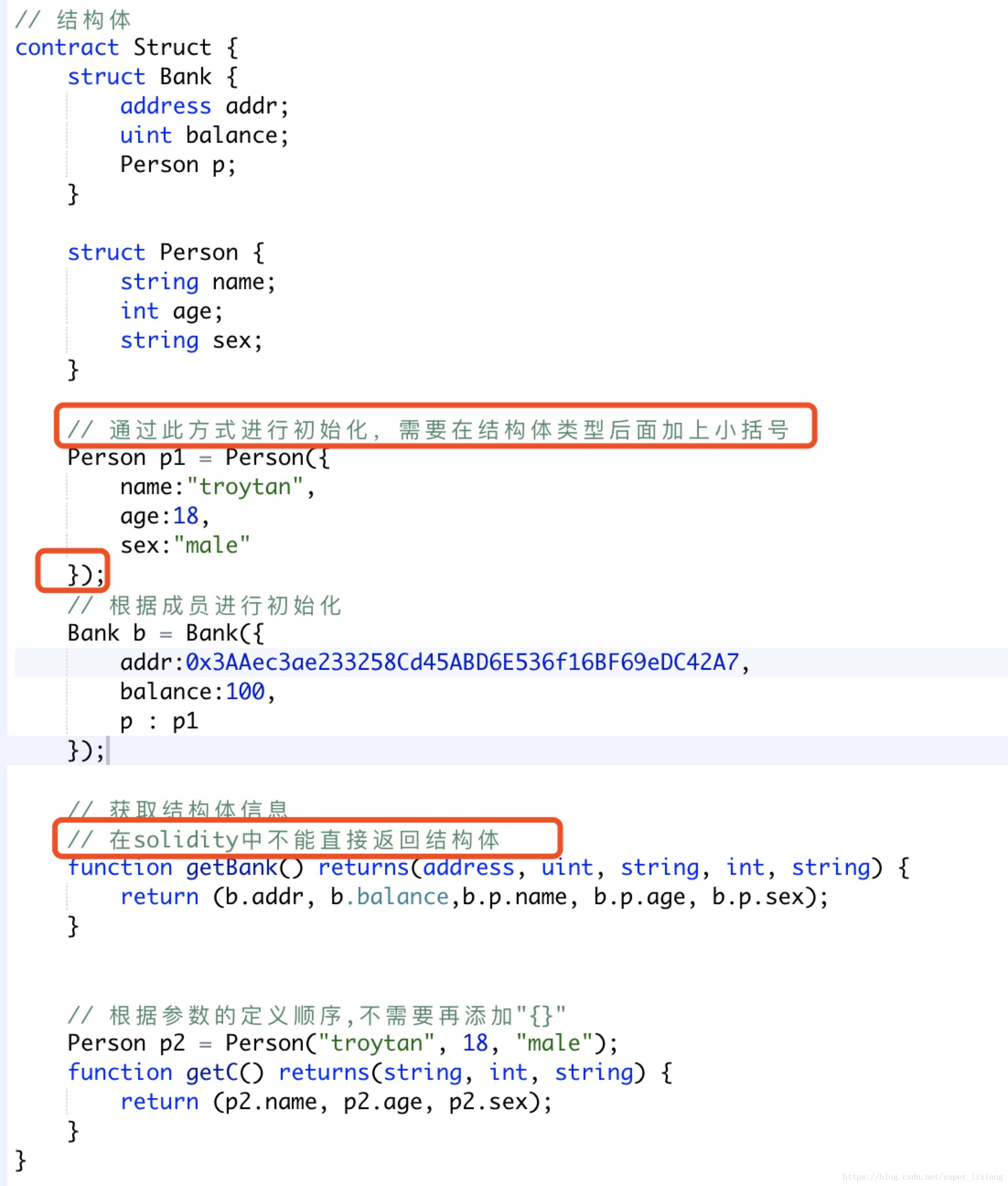 - 注意:在solidity中不能直接返回结构体,只能返回成员