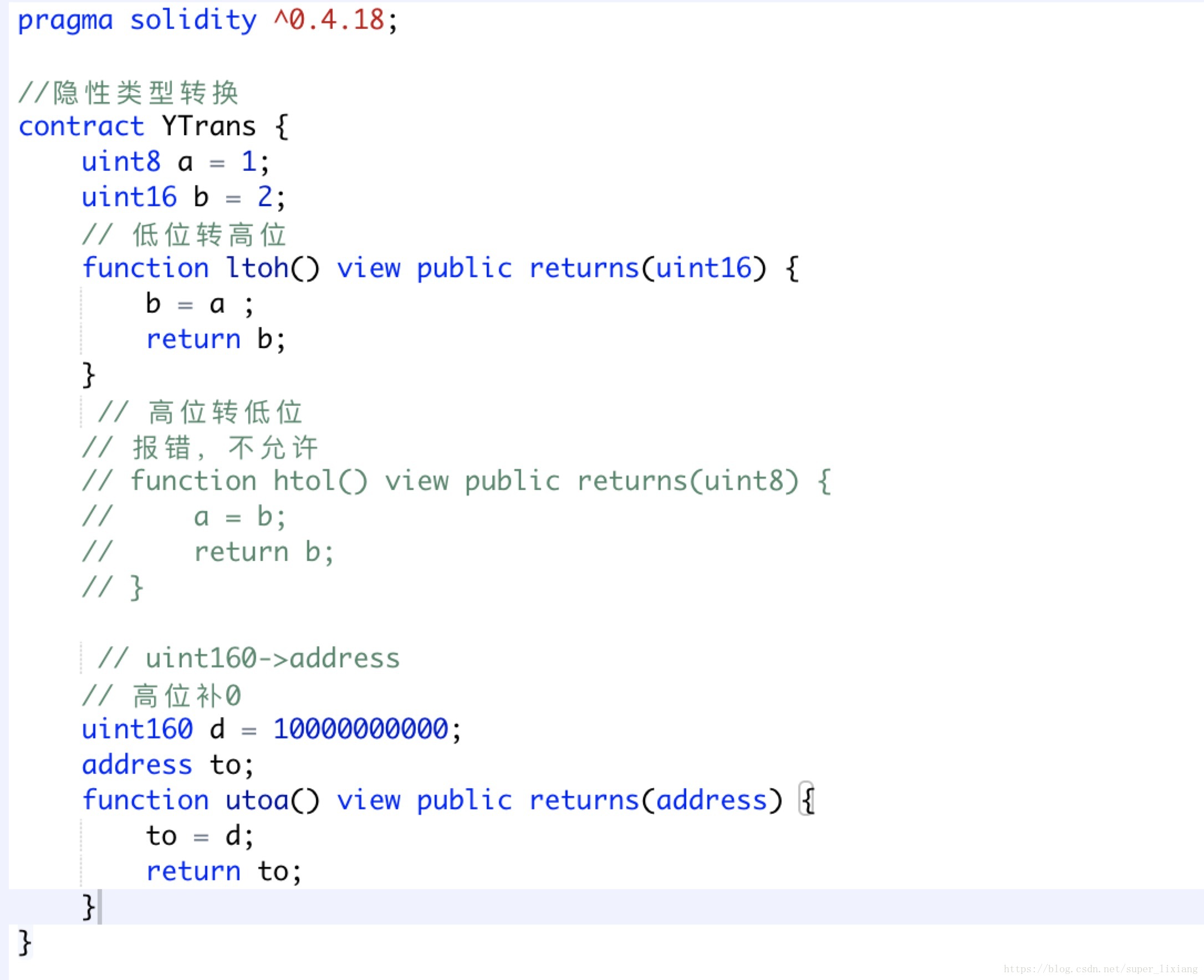 - 任何无符号的整数都可以转换为相同或者更大大小的字节值。比如任何一个可以转换为uint160的变量都可以转换为address类型。如果说uint160的数据没有达到上限值,高位补0。