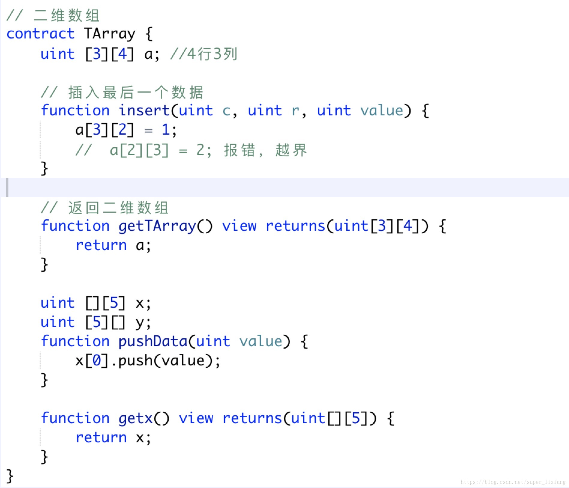 - 注意,在solidity中,二维数组的行列位置与大多数编程语言(golang..)是相反的。前面是列,后面是行。