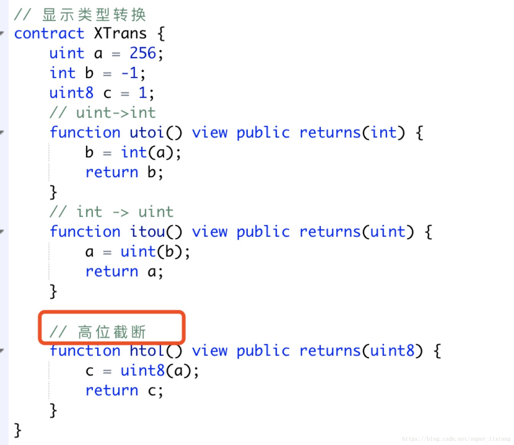 - 注意,如果说由一个大类型(uint32)转换为小类型(uint16),高位会被截断。