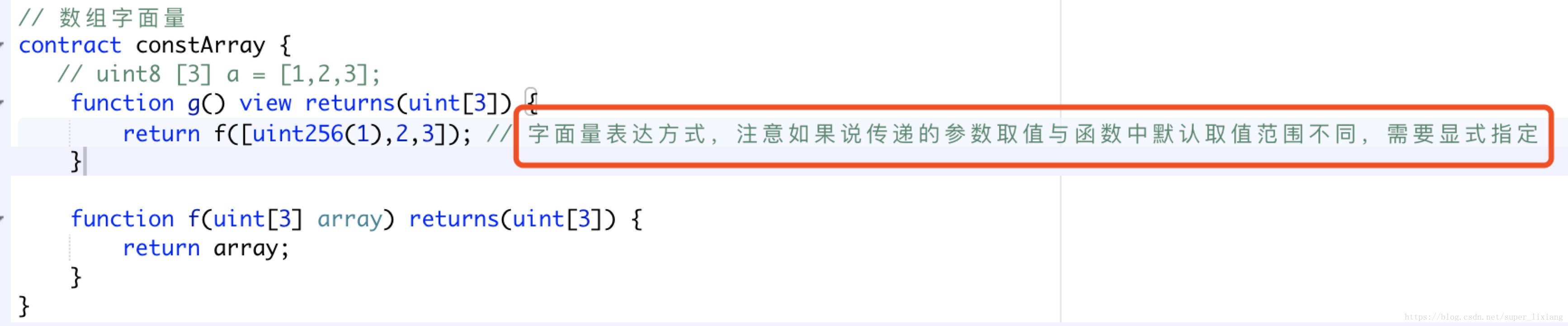 - 数组字面量:是指以表达式的方式隐式声明一个数组,并作为一个数组变量的使用的方式,通过字面量只能创建memory的定长数组。元素类型正好是能够存储的元素的长度