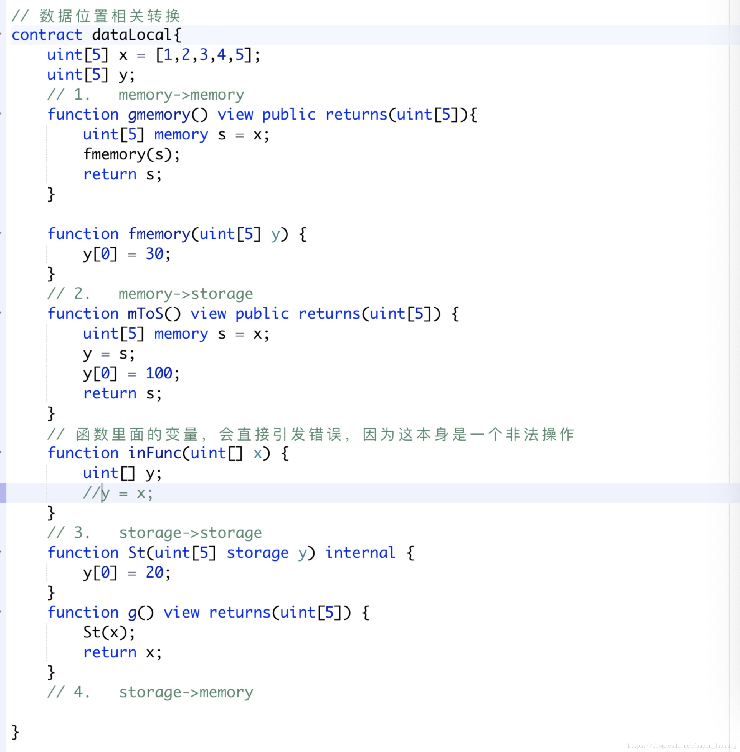 - calldata: 不用在程序中去指定,该位置上的数据是只读的,不持久化到区块链上,一般在外部函数才会指定