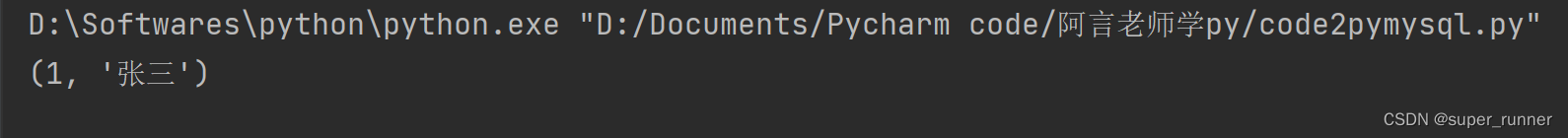 # 1.导包 from pymysql import connect # 2.创建连接对象 conn = connect( host='localhost', user='root', port=3306, password='Fjp970214', database='py-1', charset='utf8' ) # 3.获取游标,目的就是要执行sql语句 cursor = conn.cursor() # 准备sql语句 sql = 'select * from student' # 4.执行sql语句,execute执行 cursor.execute(sql) # 获取查询的结果 row = cursor.fetchall() # 可以查询到数据库中所有的数据 print(row) # 5.关闭游标 cursor.close() # 6.关闭连接 conn.close()分析结果:案列一与案列二最终的结果是以元组的形式呈现的,案列一只能查询到数据库当中的一条数据,案列二可以查询到数据库当中的所有数据