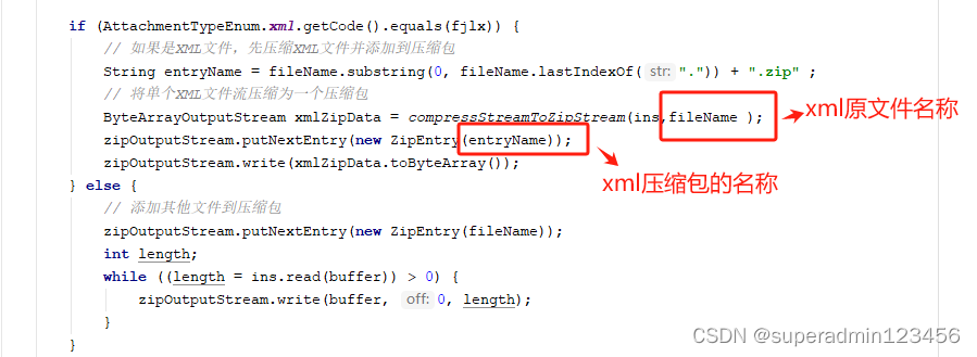 @GetMapping("/downloadMutiFileToZip") public void downloadMutiFileToZip(HttpServletResponse response, @RequestParam("qy_id") String qyId, @RequestParam("jxxlx") String jxxlx,@RequestParam("fp_ids") String[] fp_ids){ List<Map<String, Object>> fjList = daFjxxService.queryFjxxByQyIdAndJxxlx(qyId, jxxlx,fp_ids,null); //如果有附件 进行zip处理 if (fjList != null && fjList.size() > 0) { ByteArrayOutputStream zipData = new ByteArrayOutputStream(); try(ZipOutputStream zipOutputStream = new ZipOutputStream(zipData)){ for (Map<String, Object> fjMap : fjList) { String fileName = (String) fjMap.get("fjmc"); String filePath = (String) fjMap.get("fjlj"); String fjlx = fjMap.get("fjlx").toString(); String multiModeType = SpringUtils.getBean(ISysConfigService.class).selectConfigByKey("sys.upload.type"); //以下代码为获取附件inputStream InputStream ins = multiModeFileSimpleContext.getInputStream(response, fileName, filePath, multiModeType); if (ins == null) { continue; } byte[] buffer = new byte[1024]; if (AttachmentTypeEnum.xml.getCode().equals(fjlx)) { // 如果是XML文件,先压缩XML文件并添加到压缩包 String entryName = fileName.substring(0, fileName.lastIndexOf(".")) + ".zip" ; // 将单个XML文件流压缩为一个压缩包 ByteArrayOutputStream xmlZipData = compressStreamToZipStream(ins,fileName ); zipOutputStream.putNextEntry(new ZipEntry(entryName)); zipOutputStream.write(xmlZipData.toByteArray()); } else { // 添加其他文件到压缩包 zipOutputStream.putNextEntry(new ZipEntry(fileName)); int length; while ((length = ins.read(buffer)) > 0) { zipOutputStream.write(buffer, 0, length); } } zipOutputStream.closeEntry(); } // 生成压缩包的文件名称 SimpleDateFormat sdf = new SimpleDateFormat("yyyyMMddHHmmss"); String timestamp = sdf.format(new Date()); String zipFileName = "电子发票"+timestamp+".zip"; // 将压缩包返回给前端 sendZipDataToClient(zipData.toByteArray(), zipFileName,response); }catch(Exception e){ e.printStackTrace(); } } } /** * @description: 将单个文件流压缩为一个压缩包的方法 * @author * @date 2024/3/23 15:30 * @version 1.0 */ private static ByteArrayOutputStream compressStreamToZipStream(InputStream stream, String entryName) { ByteArrayOutputStream zipData = new ByteArrayOutputStream(); try (ZipOutputStream zipOutputStream = new ZipOutputStream(zipData)) { zipOutputStream.putNextEntry(new ZipEntry(entryName)); byte[] buffer = new byte[1024]; int length; while ((length = stream.read(buffer)) > 0) { zipOutputStream.write(buffer, 0, length); } zipOutputStream.closeEntry(); } catch (IOException e) { e.printStackTrace(); } return zipData; } /** * @description: 将压缩包数据发送给客户端的方法 * @author * @date 2024/3/23 15:20 * @version 1.0 */ private static void sendZipDataToClient(byte[] zipData, String zipFileName,HttpServletResponse response) { try { response.setContentType("application/octet-stream"); response.setHeader("Content-Disposition", "attachment;filename=" + URLEncoder.encode( zipFileName, "utf-8" )); try (OutputStream outputStream = response.getOutputStream()) { outputStream.write(zipData); outputStream.flush(); } } catch (IOException e) { e.printStackTrace(); } finally { if (response != null) { try { response.flushBuffer(); } catch (IOException e) { e.printStackTrace(); } } } }