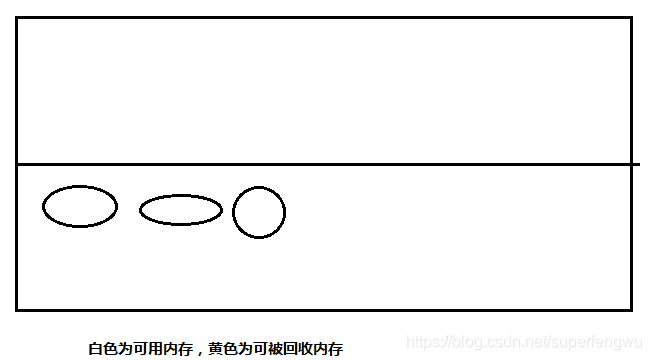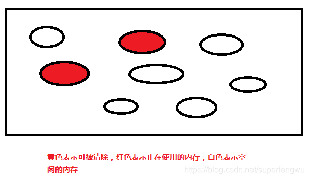 第一种最low的就是标记-清除算法。它原理就是运用可达性分析法找到虚拟机栈中的垃圾对象做标记,然后把标记的垃圾对象做清除。这种方法的弊端有两个,一个是执行效率低(因为内存碎片太多,内存不连续,导致分配大空间内存的时候找不到合适的空间进行分配,这时候还需要进行另一次的垃圾回收十分影响性能),一个是会产生太多的内存碎片,因为标记的垃圾对象在内存中不是连续的,所以有该问题。如图: