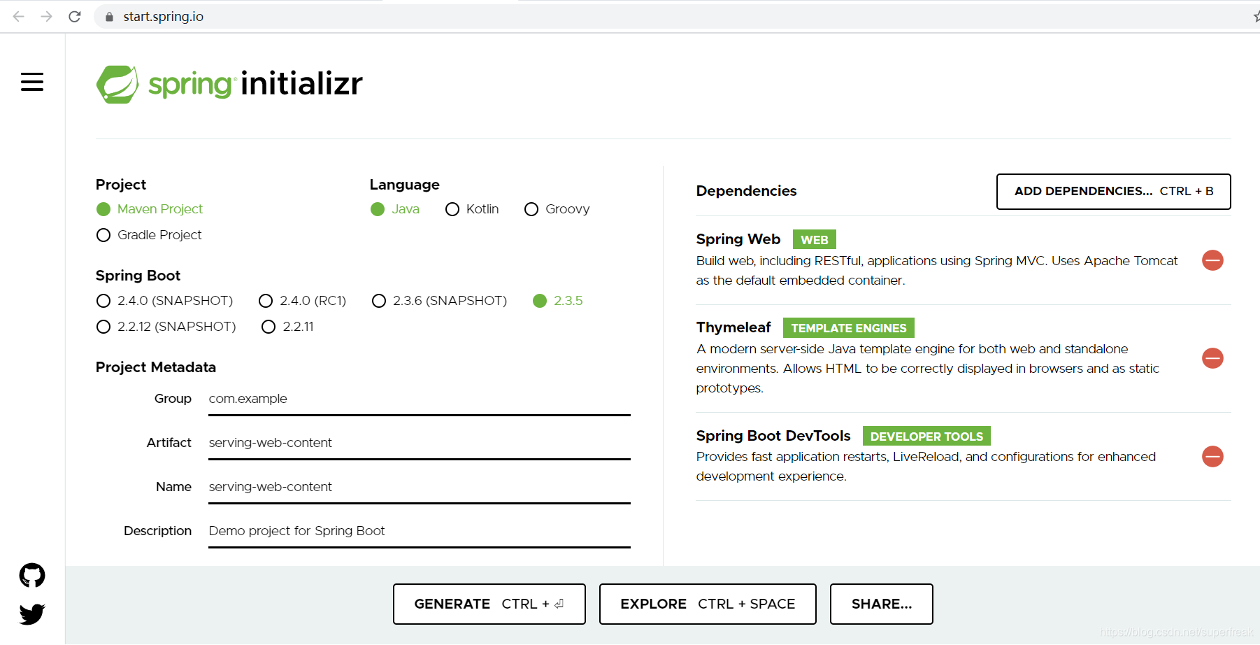 就是在右侧加入依赖:Spring Web, Thymeleaf, and Spring Boot DevTools 如下图